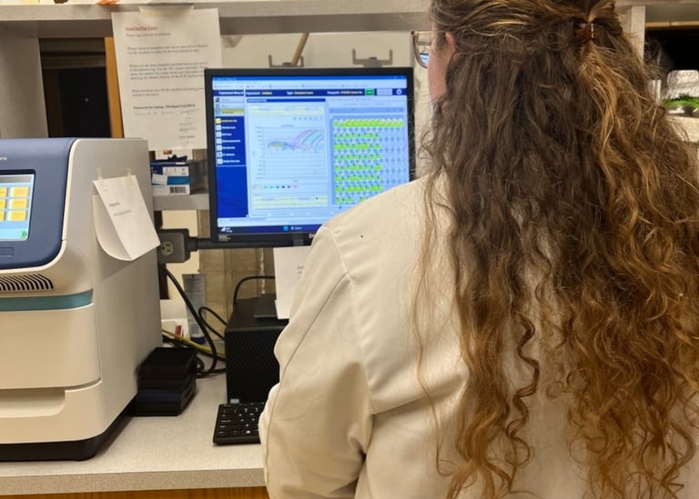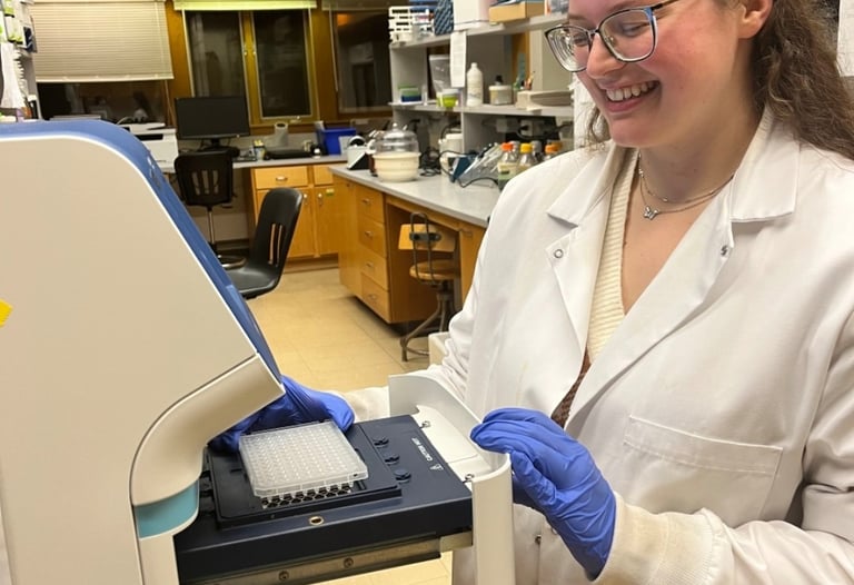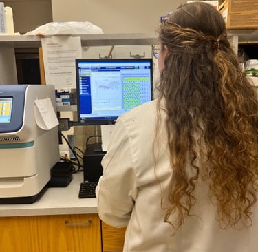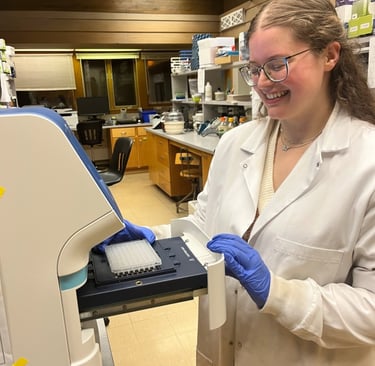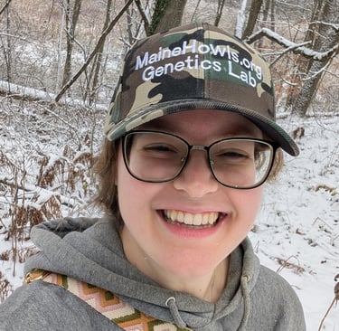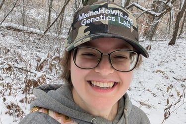 Sarah isn't always in the lab processing DNA - here she is enjoying the beautiful wilds of Michigan. A 2024 survey estimates a healthy & stable population of 762 wolves/158 packs in the Upper Peninsula. Nice hat Sarah! (Right) (Photo credit: Sarah)