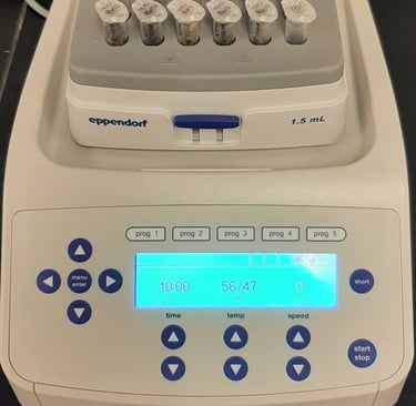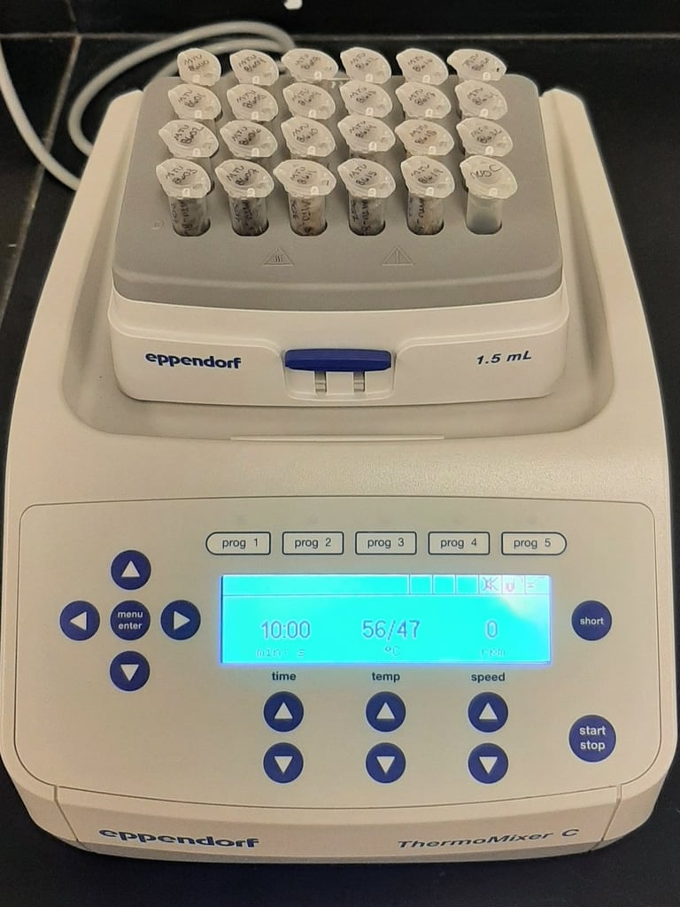 Genetic samples in a ThermoMixer (Photo credit: Sarah)