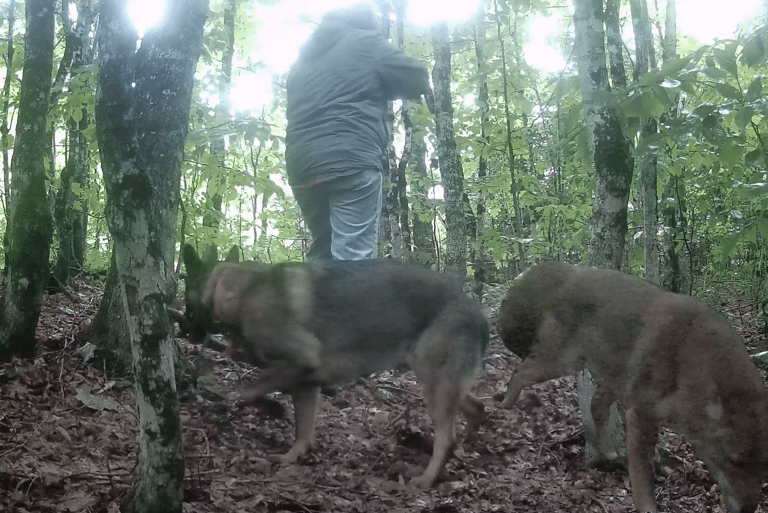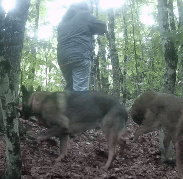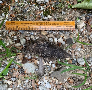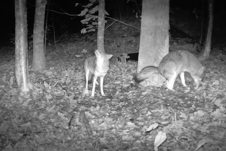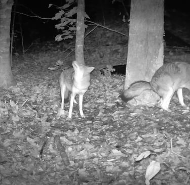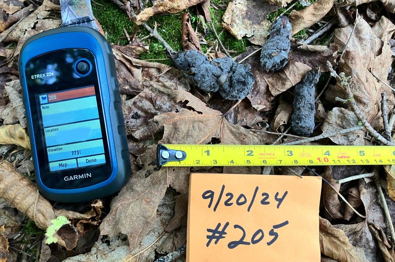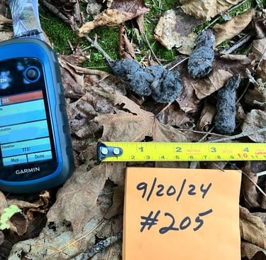 A male Canis leaving a scat sample in northern Maine, October 2024. This is an interesting group of animals that we have located and are watching closely. They are in a very remote location. Fortunately, Jennifer serviced this camera the following day and collected the DNA - Sample #X108 - The first using our new tubes/solution and protocol. This is an animal of interest because of it's size and overall appearance (right).