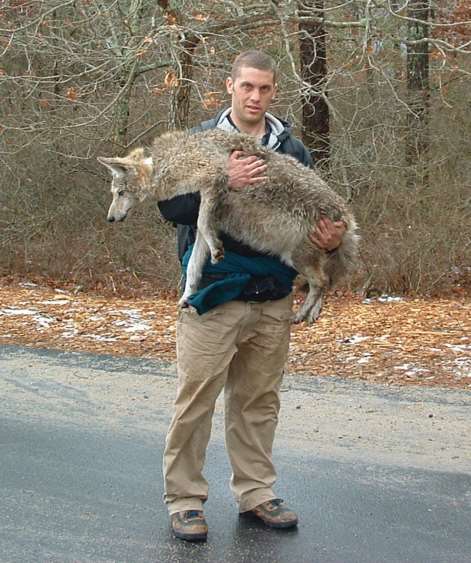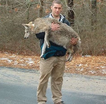 Our wildlife biologist Jon with an eastern coyote/coywolf that was trapped, sedated and radio collared as part of a previous study that he headed. Jon's PhD dissertation was about eastern coyotes in Massachusetts, and he literally "wrote the book" about these animals. (Left) (Photo credit: Jon)