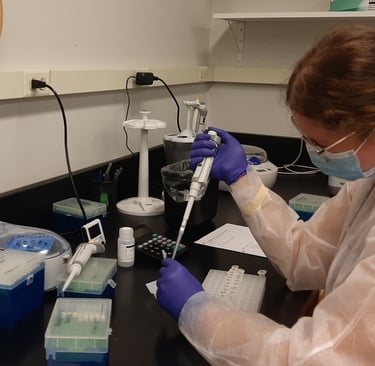 Sarah finishing up the QC (extractions, qPCR) of our first batch of samples. The lab will now proceed with genotyping the samples that have enough host DNA. Sequencing will hopefully be completed soon. We're very fortunate and appreciative to be "invited into the lab" to see this end end of the process. (Photo credit: Sarah)