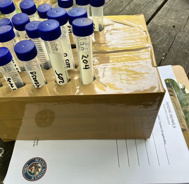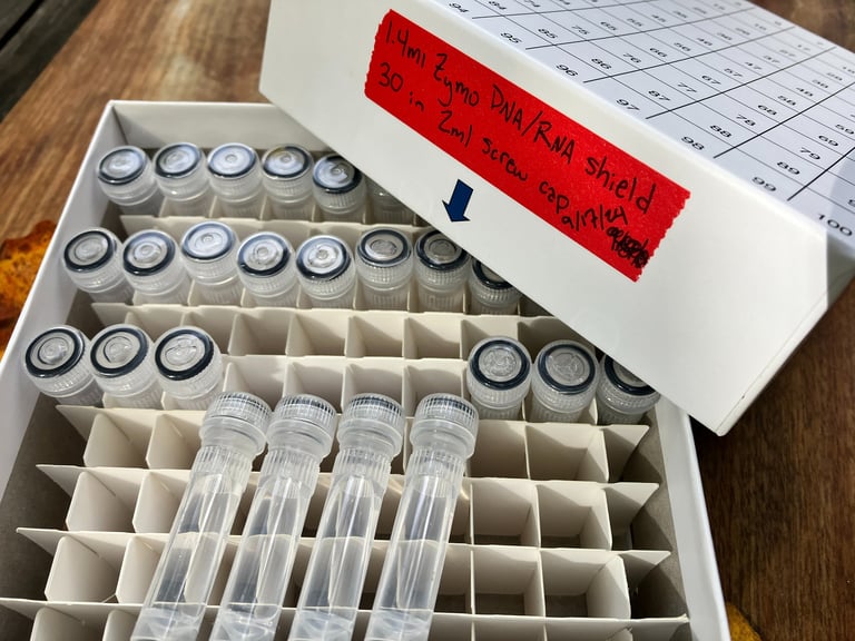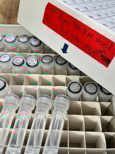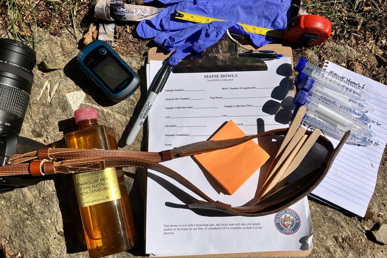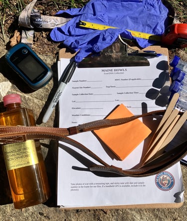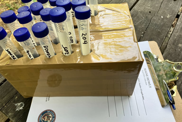 FROM THE FIELD TO THE LAB - Maine Howls has partnered with the Brzeski Conservation Genetics Lab at MTU's College of Forest Resources and Environmental Science to analyze the DNA samples that we locate, collect and preserve. The results of these tests will be added to our database of videos, measurements, vocalizations and more. Combined, this array of information will provide some fresh details regarding the specific origins of the animals that we are studying. Genetic studies have been completed in past years, but never before with a panel designed specifically for the Northeast US that includes documented populations of nearby eastern wolves/Algonquin wolves (Canis lycaon, C. lupus lycaon, or C. lupus x C. lycaon) in Canada. In past years we have successfully collected scat samples in 15ml centrifuge tubes using a preservation solution of pure ethanol alcohol (CH3CH2OH). This procedure has proven to provide viable DNA. Dr. Brzeski reminds us that final genotyping success typically ranges from 30% to 50%. Often, scientific papers report only samples that pass initial quality control steps, which exclude those without sufficient host DNA. Additionally, some samples might amplify partial genotypes but don't produce the full genetic profile needed for accurate group assignments. We have recently implemented the collection protocol that the university developed, and are now using a different buffer called "DNA/RNA shield" in screw cap tubes. This reagent is a DNA and RNA stabilization solution manufactured by Zymo Research. Upgrading our collection protocol in this way should increase our viability success rate even further.