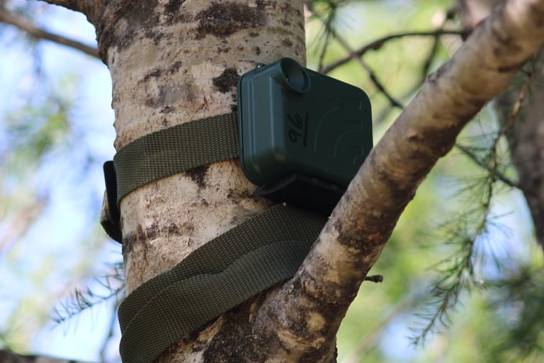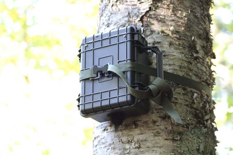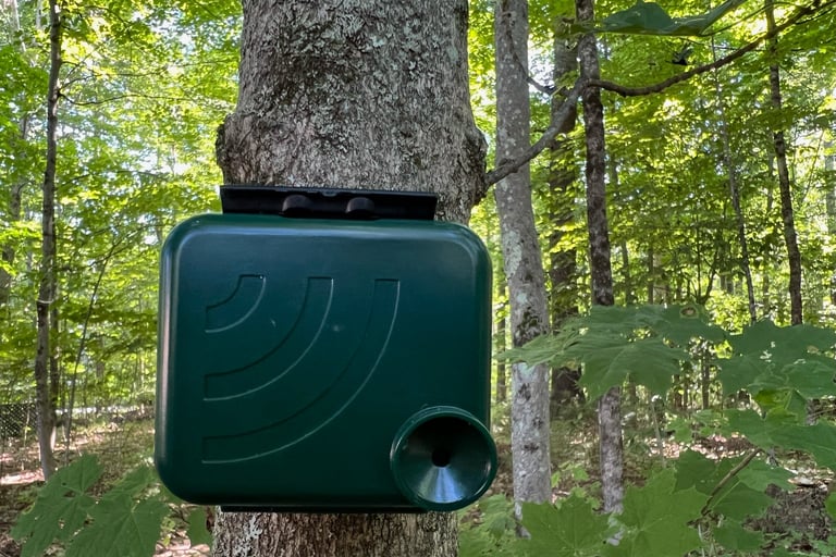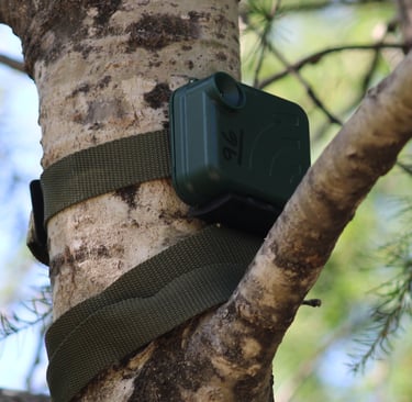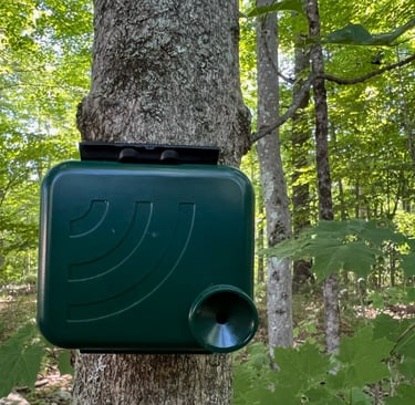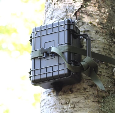 Standard ARU units deployed by Maine Howls (above and below). These are designed and manufactured by Open Acoustic Devices. This particular unit is called an AudioMoth. These loggers are a low-cost, open-source acoustic monitoring device used by many wildlife researchers to record and study things as diverse as insects, ultrasonic bat calls and have even been used to detect the sound of gunshots in an effort to catch poachers.