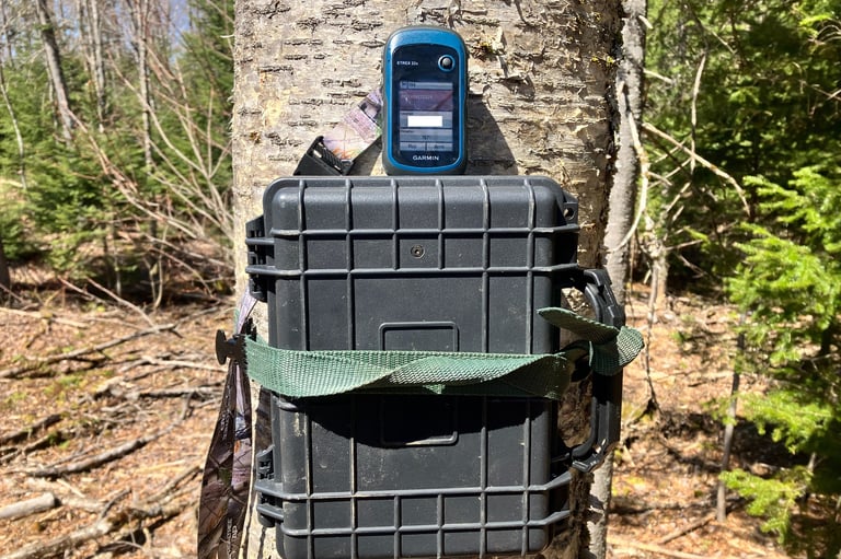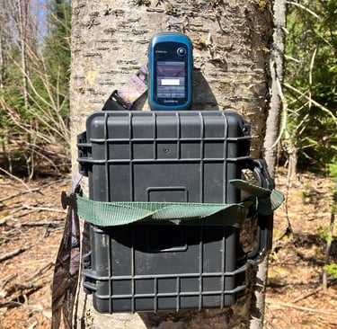 A custom Maine Howls ARU build now deployed, with a handheld GPS unit in the picture to document the location (right).