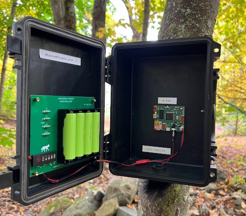 Our engineer keeps busy - here is one of Jim's constructs. It's a custom ARU build powered by four rechargeable 18650 lithium batteries. Lithium batteries perform better in the cold than others, and we have used expensive, disposable Energizer lithium cells in the past. There is an upgraded omnidirectional exterior mic on the bottom of the unit hiding in the fuzzy wind-break. This Maine Howls ARU protype is still being tested, and if it works like we hope, the larger capacity and higher voltage will both save us on battery cost and allow for longer deployment times while recording a much higher quality sound (left).